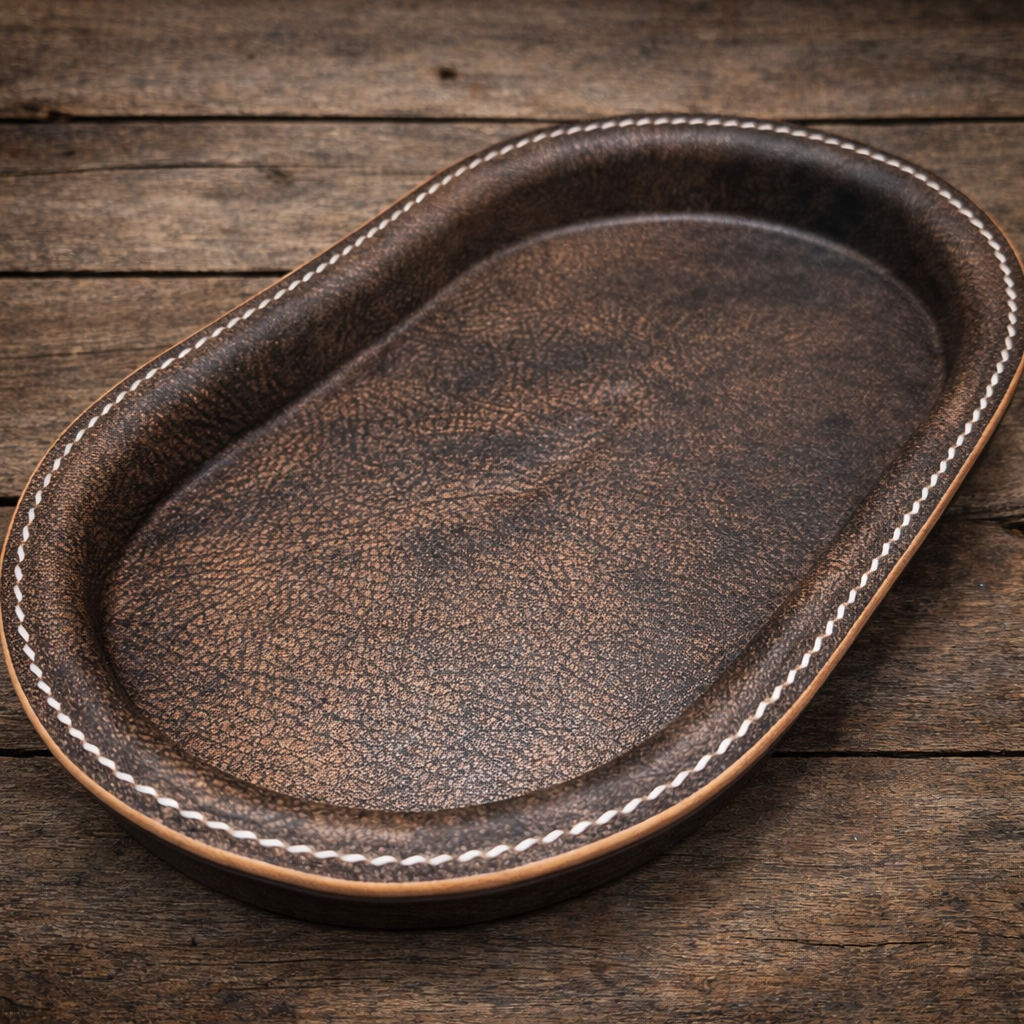 Jede dieser hochwertige Aufbewahrungsschalen wird einzeln gepresst und sorgfältig von Hand mit der Sattlernaht genäht.