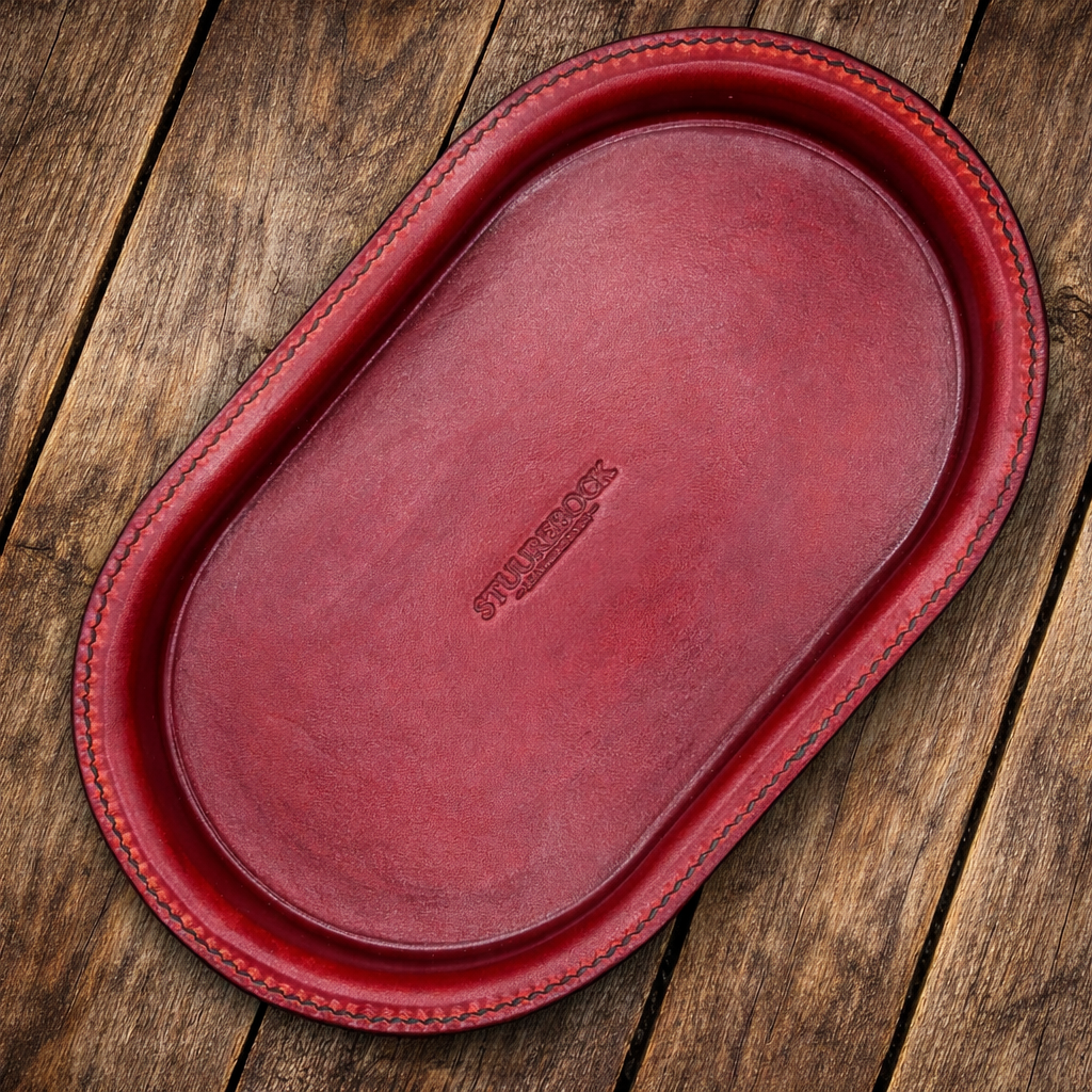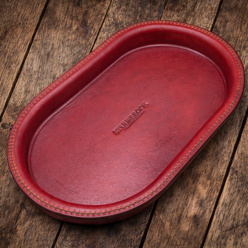 Jede dieser hochwertige Aufbewahrungsschalen wird einzeln gepresst und sorgfältig von Hand mit der Sattlernaht genäht.