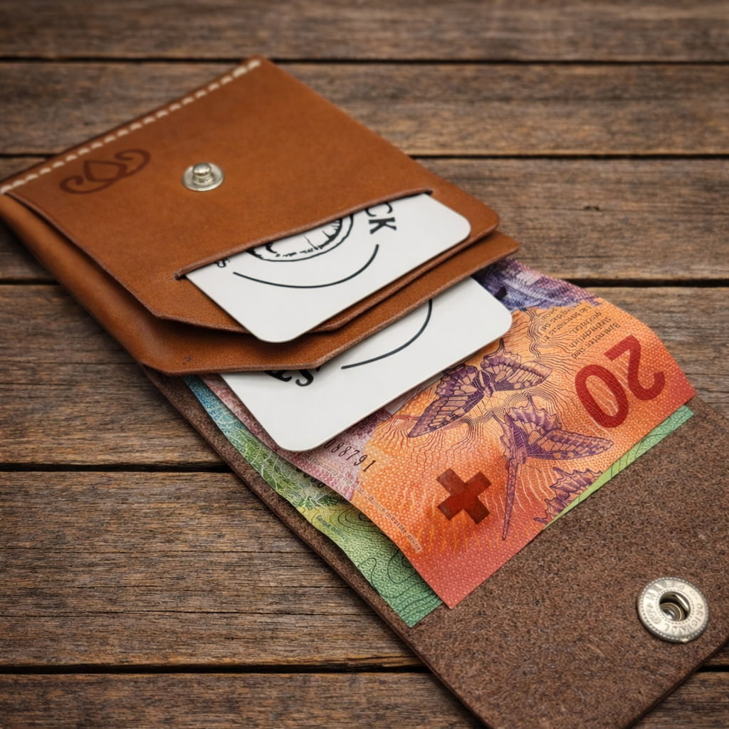 Durch diese minimalistische Konstruktion entsteht ein Portemonnaie, das nicht nur optisch überzeugt, sondern auch extrem robust ist. Weniger Verbindungen bedeuten weniger Verschleissstellen.
