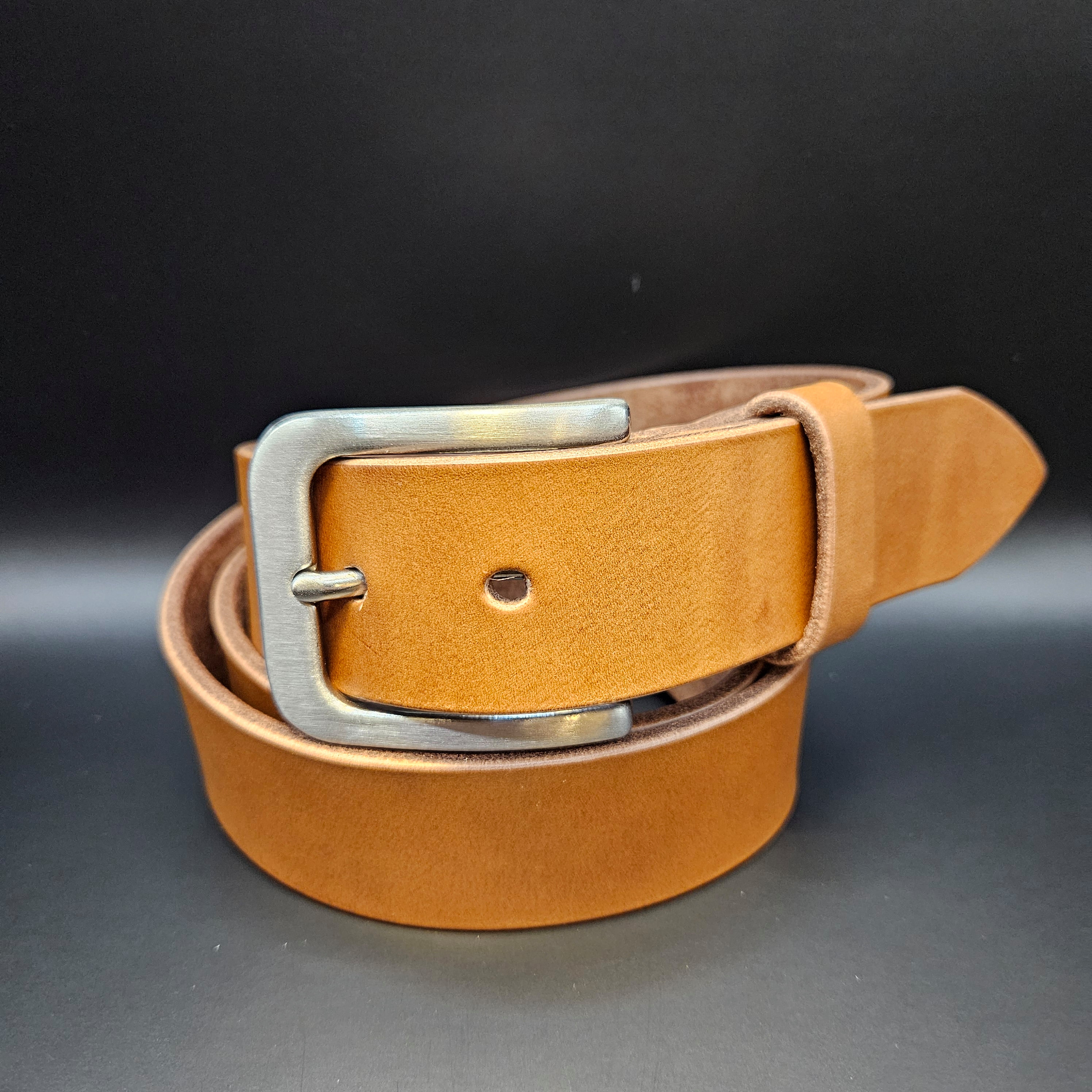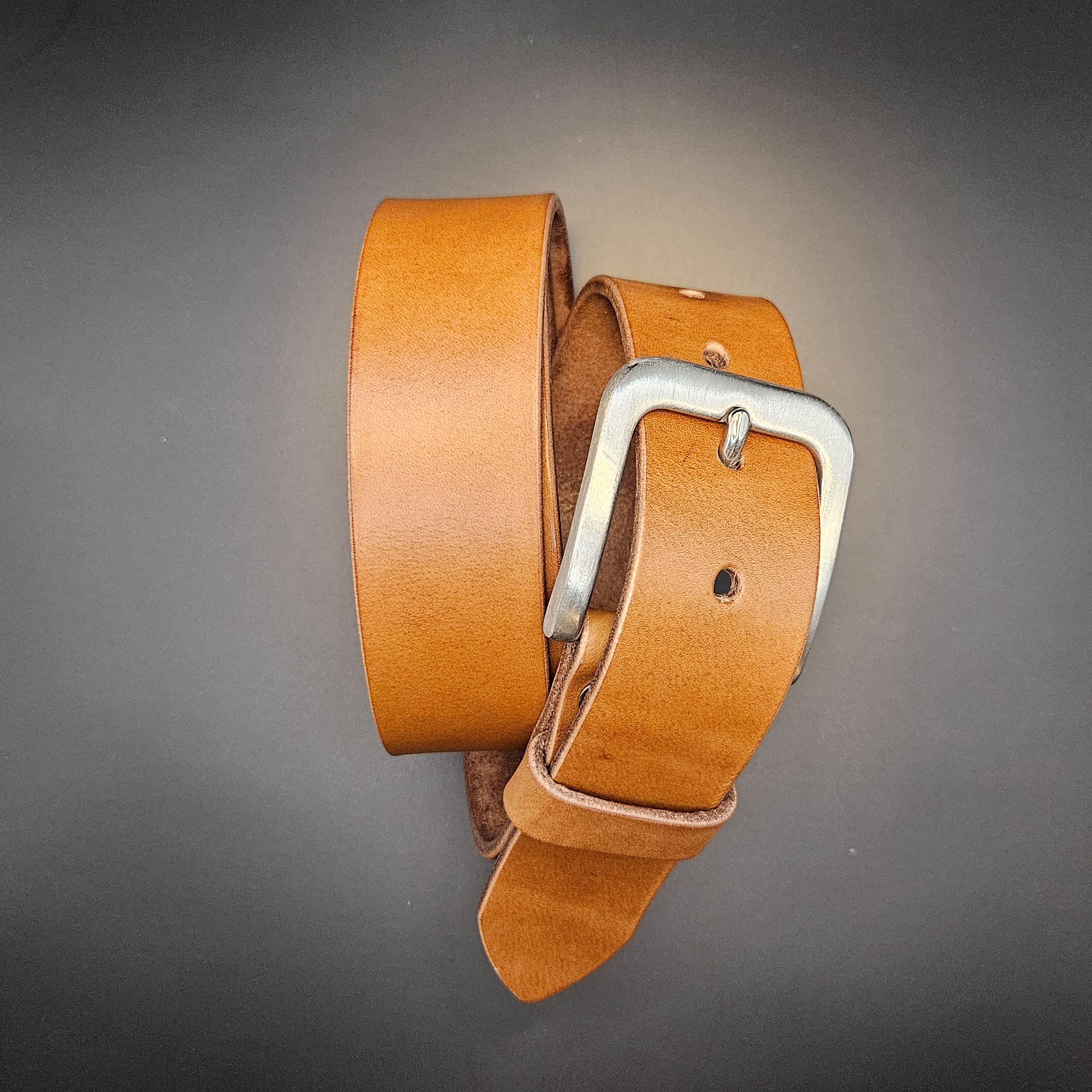 Der Gürtel aus pflanzlich gegerbtem Leder wird mit polierten Kanten ausgeliefert. Der Abstand zwischen den Löchern beträgt ca. 2.5 cm.